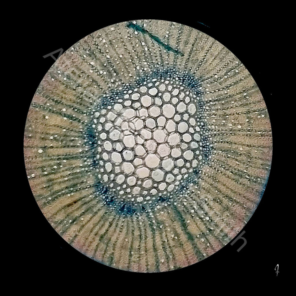 Met flinterdunne coupes van plantendelen – zoals steeltjes, blaadjes en zaadjes – onthult microscopie een verborgen wereld vol kleur en textuur. Dankzij een speciale, genormaliseerde kleuring met Astrablauw en Acridinerood worden celstructuren zichtbaar.